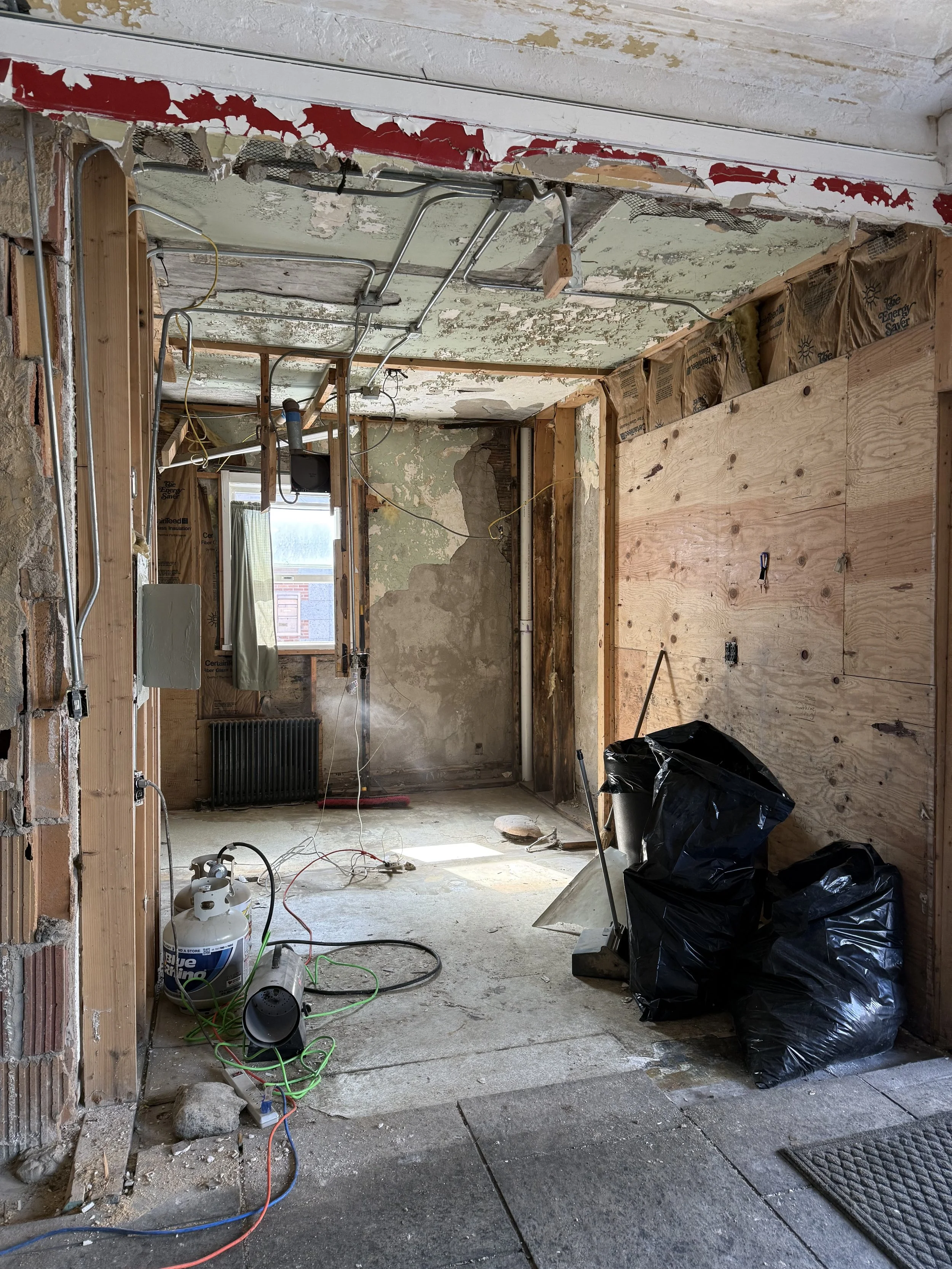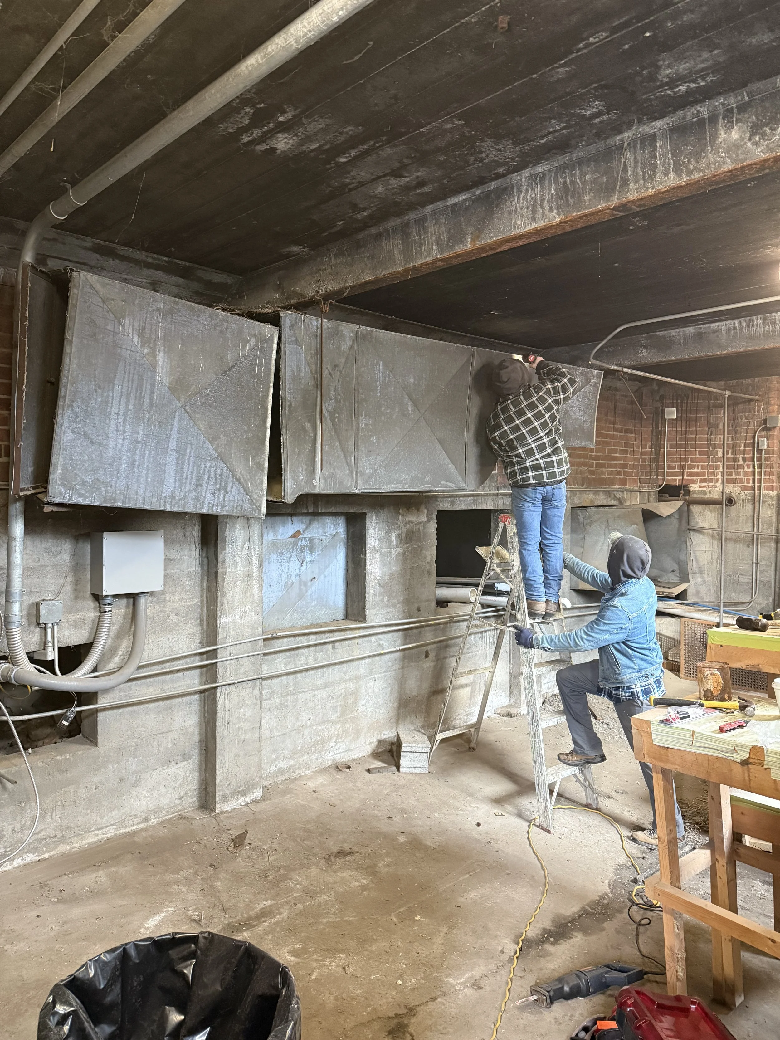 Thanks to our amazing local crew, the team finished the tear out of old duct work in the old boiler room to prepare for the electric upgrade! We also finished the tear out of the bathrooms and lobby.
