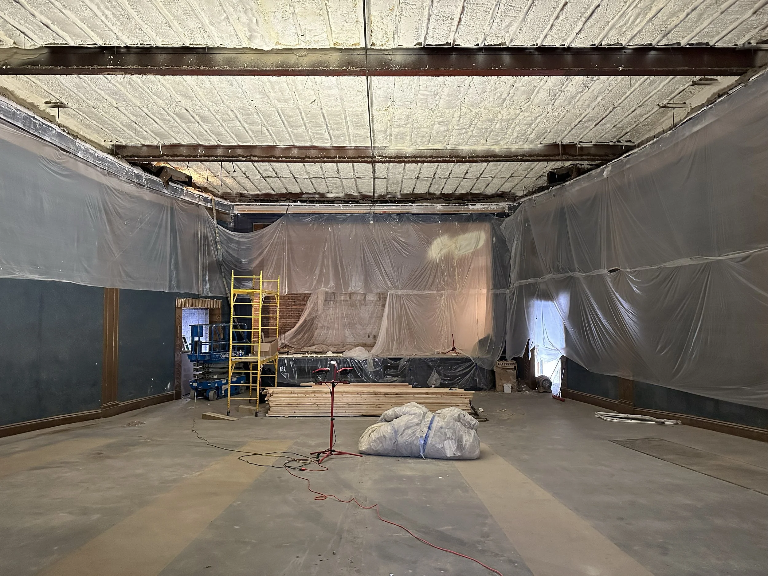 With a goal to return the theater to a single performance venue, we began the big job of tearing out the wall that boarded up the proscenium and removing the large 20+ ft wall that divided the theater in two. When we say “we,” we mean huge thanks to Tim Bedard who single handedly torn down the walls and removed all the debris!