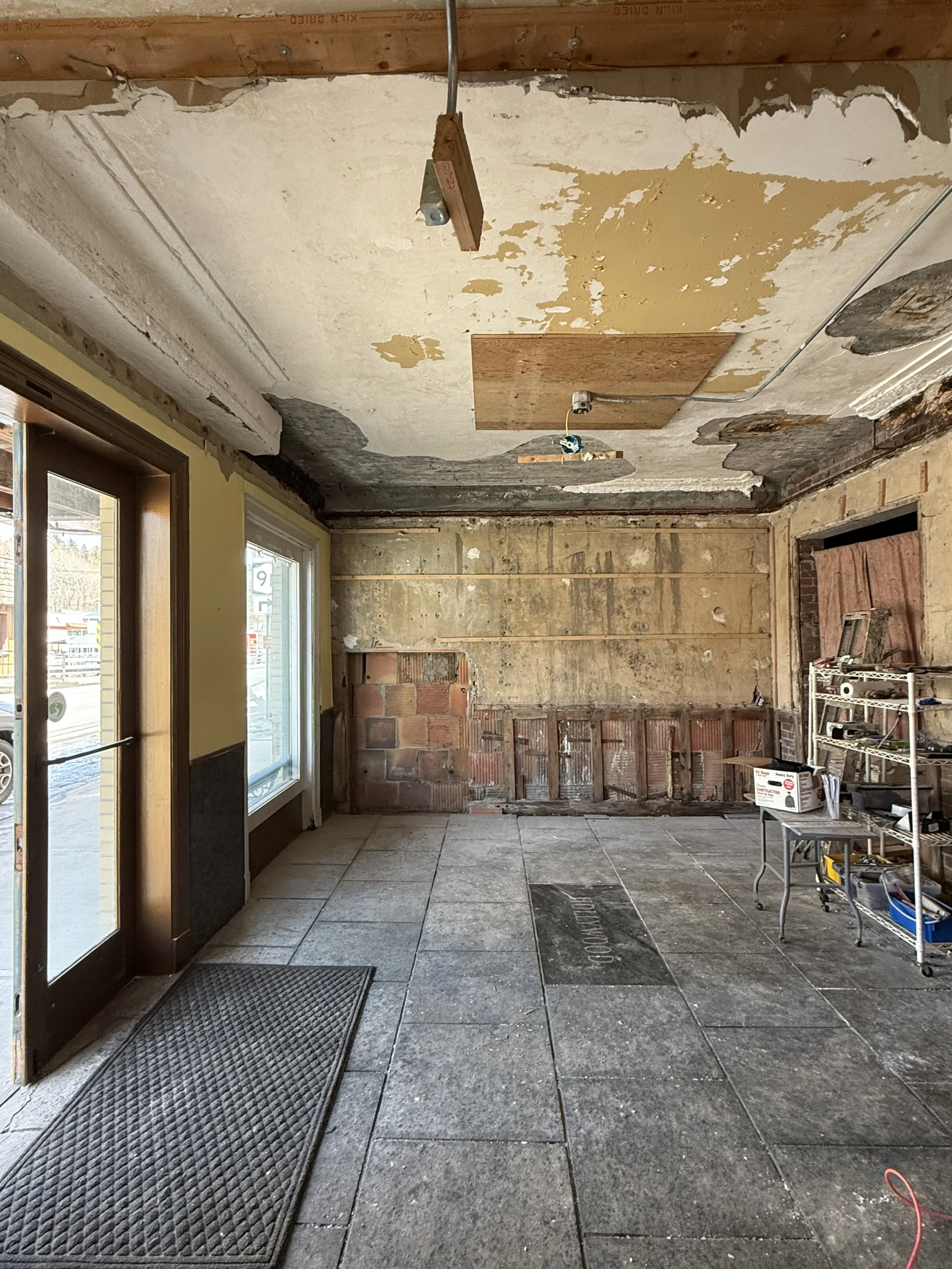 To re-imagine the space, we needed a clear slate. We began tearing out the concessions and lobby as well as the walkway which lead to two theaters and the bathrooms. We preserved the original wood moldings and architectural elements. In the process, we discovered that the timber originally milled for our theater originated from A. Mason & Sons Lumber, Peru / Plattsburgh, NY.